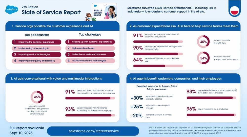 Survei tersebut dirangkum dalam laporan State of Service yang dirilis Salesforce, perusahaan CRM berbasis AI nomor satu di dunia. Hasilnya menegaskan bahwa AI tidak lagi sekadar alat otomasi untuk pengambilan keputusan, melainkan telah mengubah cara kerja, pengembangan karir, hingga ekspektasi pelanggan terhadap layanan.